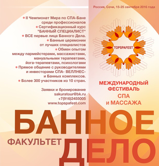 17 сентября лучшие парильщики мира будут демонстрировать свое искусство и мастерство за звание «Чемпиона мира по СПА Бане среди профессионалов». Судить и выявлять лучшего, будут самые авторитетные специалисты банной отрасли, все желающие смогут посмотреть соревнования. Стоимость участия в соревнования составляет – 150 евро. (без проживания). Регламент соревнований будет опубликован на сайте whttp://topspafest.com в ближайшее время.